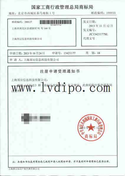商標受理通知書