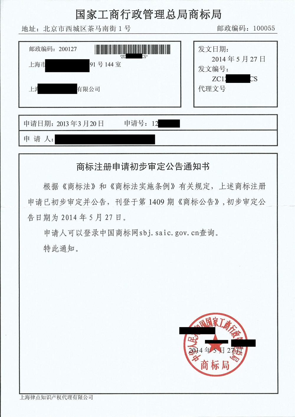 商標(biāo)注冊(cè)申請(qǐng)初步審定公告通知書